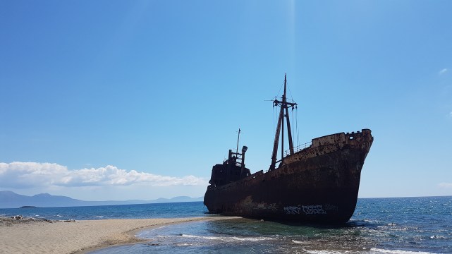 As we drove along the coast we found an old shipwreck on the beach, the Dimitrios Shipwreck. There are rumours that the ship was smuggling cigarettes and deliberately wrecked to dump its illegal cargo rather than sailing to the port to be found by authorities. However in reality it was probably just abandoned by the owner.