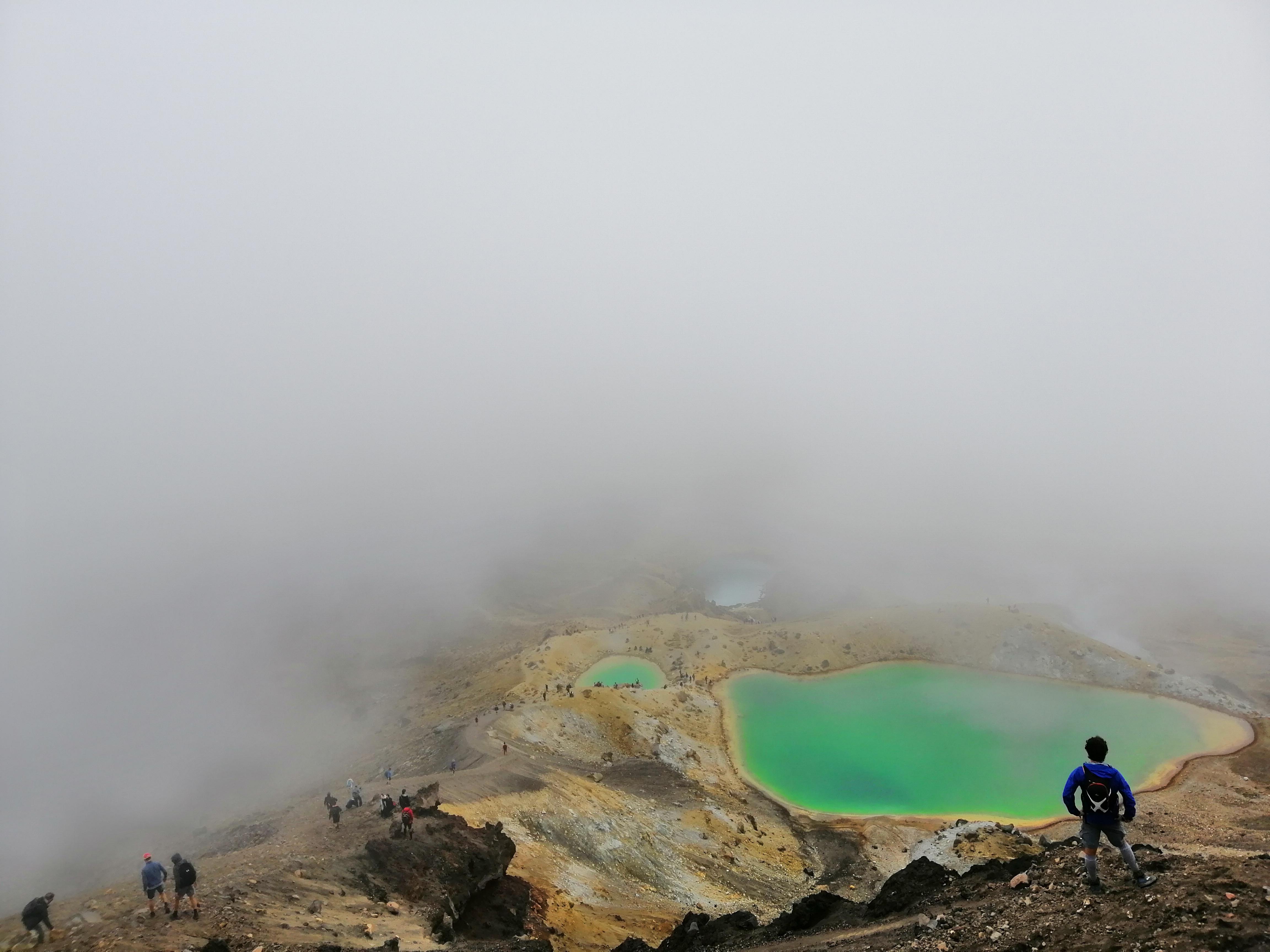 It was a very overcast day but the run/walk up through the Mangatepopo Valley and up the aptly named Devil’s Staircase was still spectacular. It wasn’t until we were climbing up to the top of the Red Crater that that we were immersed in cloud. In a hope that the clouds would clear by the time we reached the top we pushed forward, battling the winds and crumbling volcanic rock beneath our feet. Sure enough we arrived just in time to see the iconic lakes through a clearing in the cloud. They sure were stunning, bold greens and blues shining out through the white fog, totally worth it.